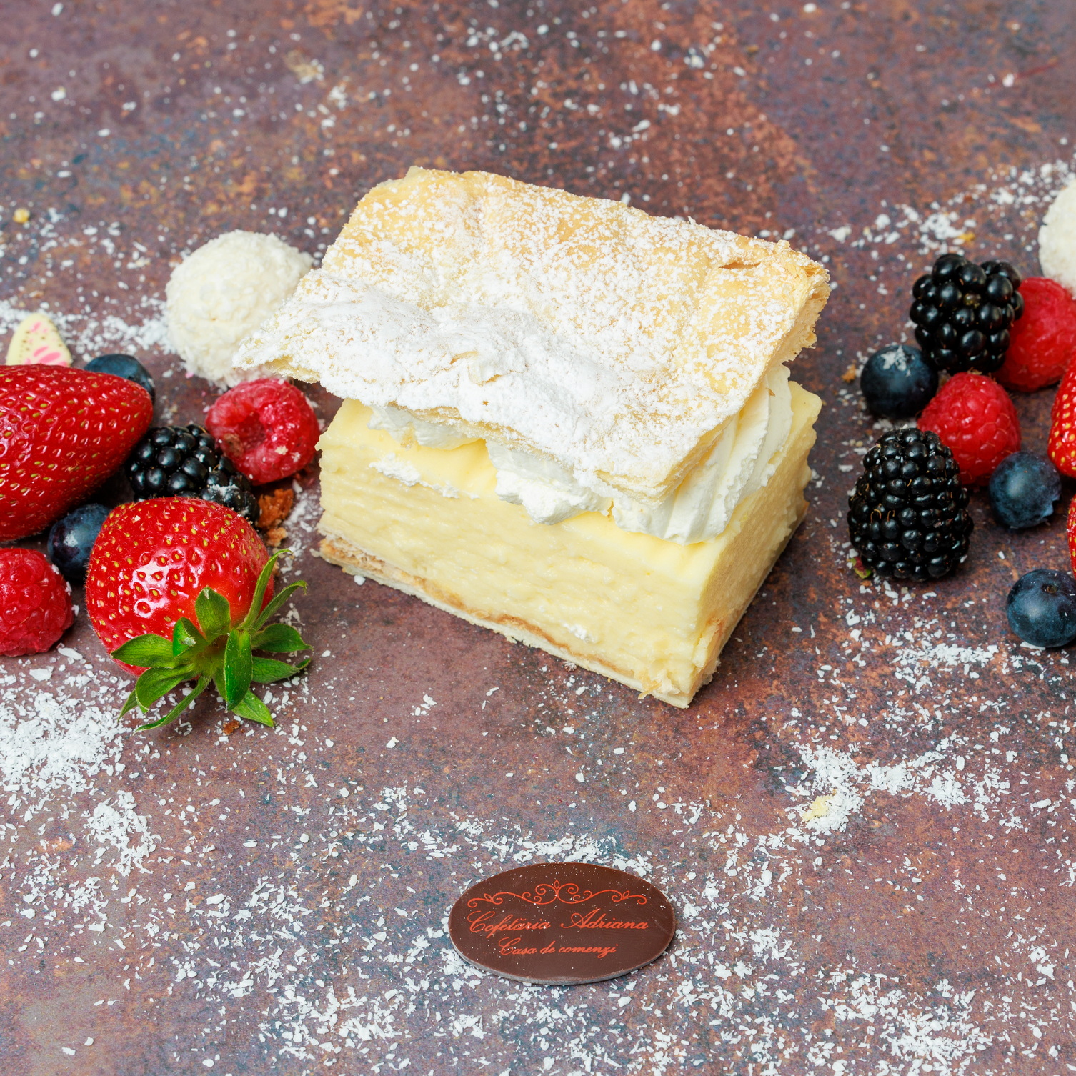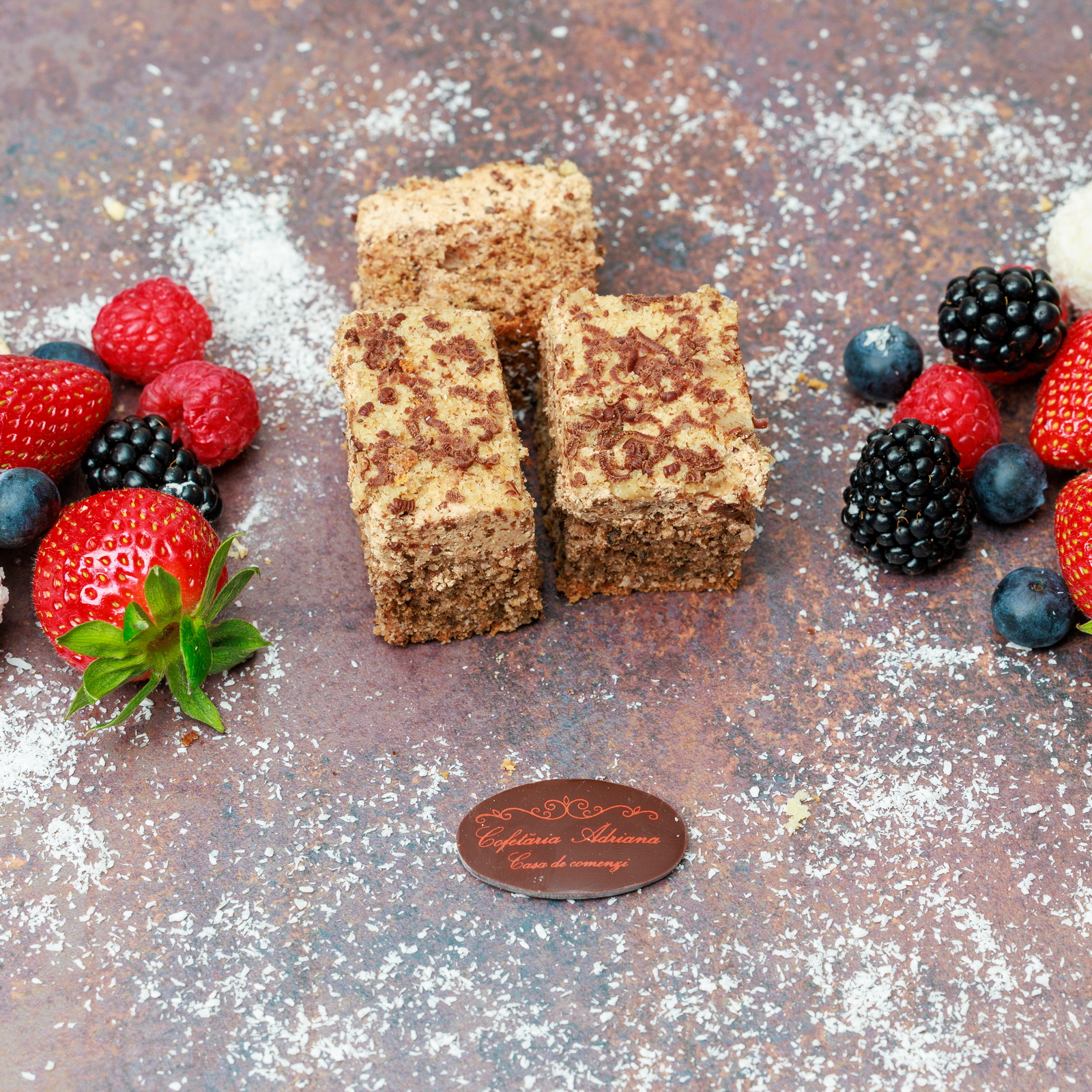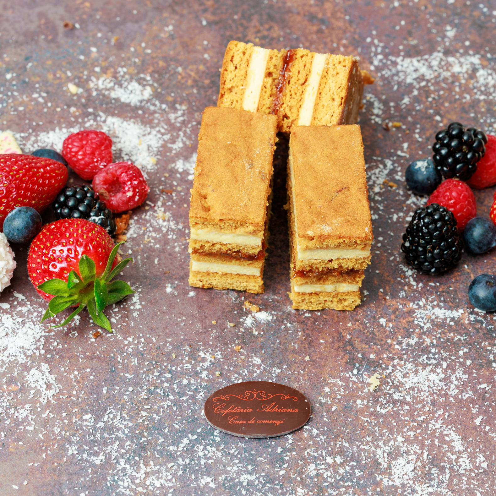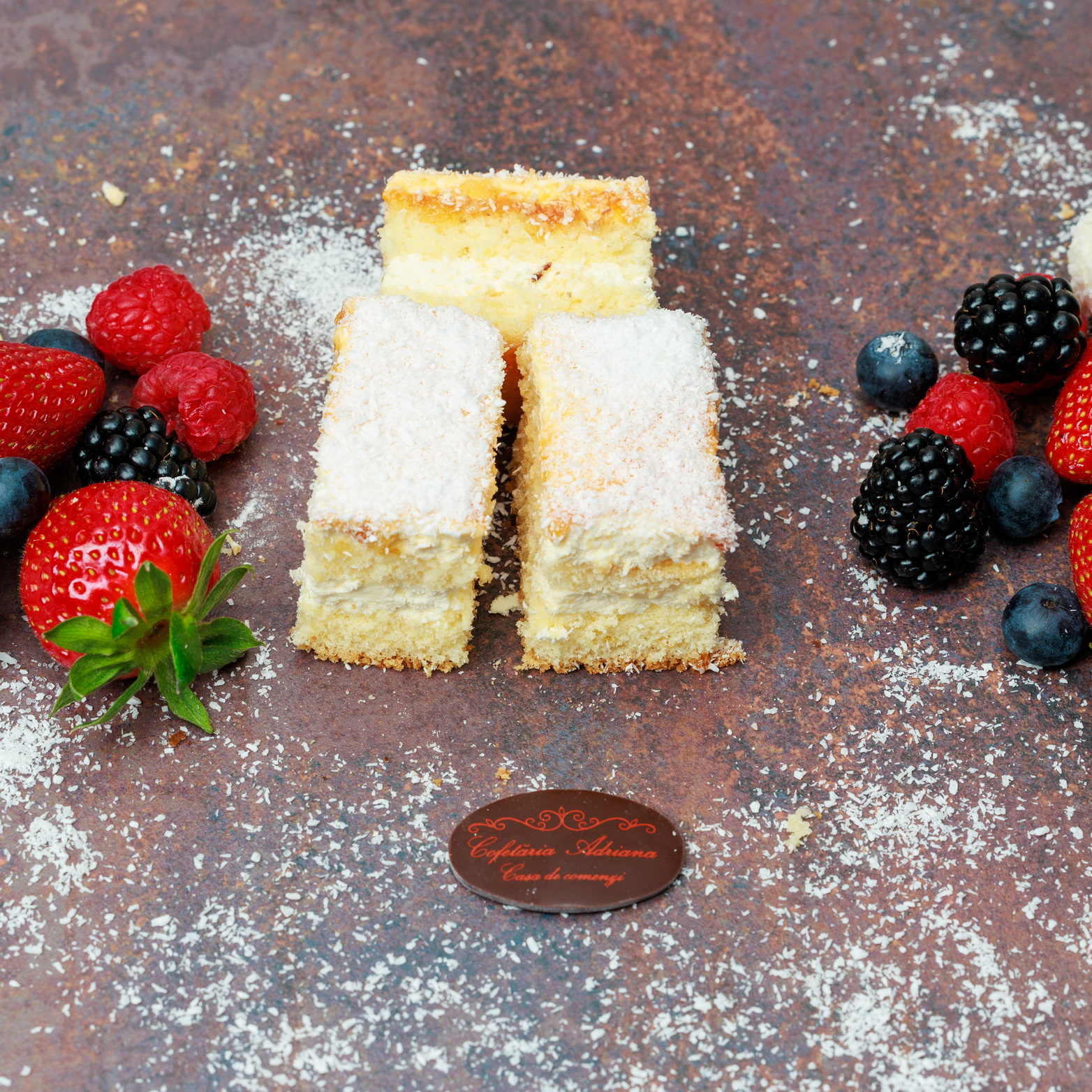 - oua, zahar, faina, frisca lichida, unt, mascarpone, razatura lamaie, zeama lamaie, gelatina, fulgi de cocos, gem de caise (E160)